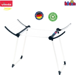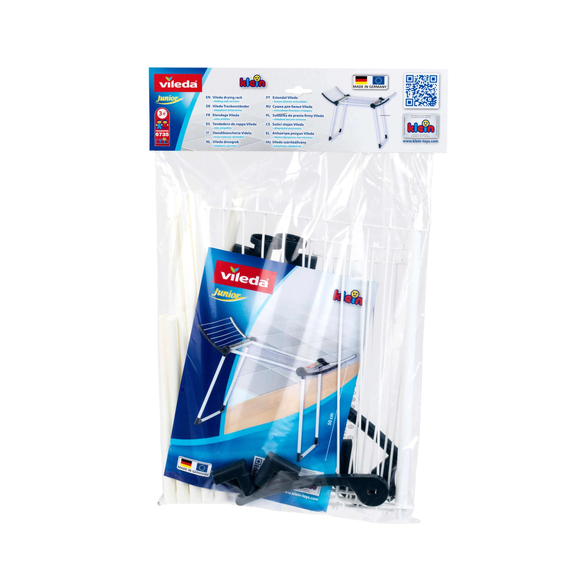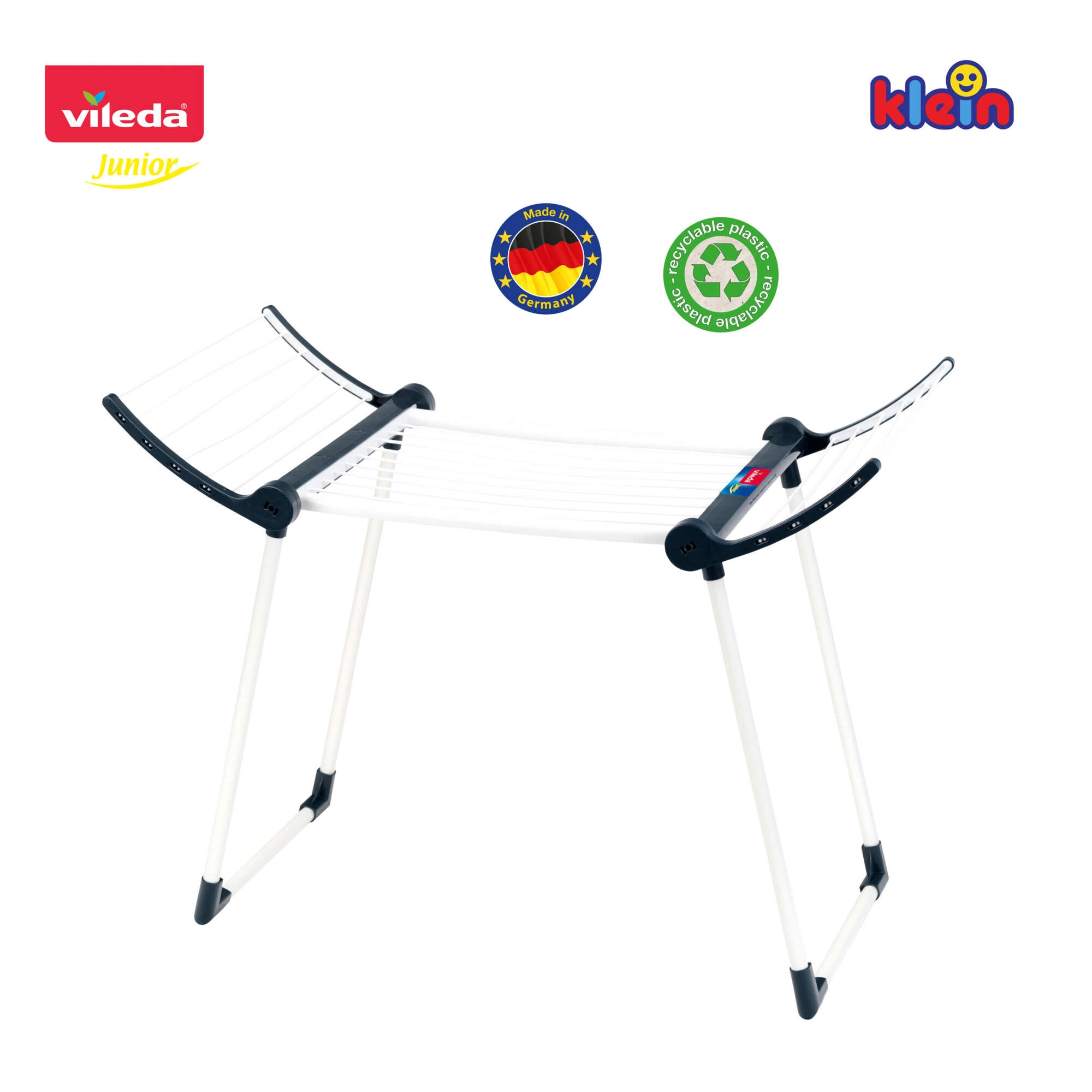 Het kinder wasdroogrek Vileda met VILEDA-licentie biedt een realistische huishoudervaring in een veilige uitvoering voor kleine helpers. Ideaal voor het drogen van poppenkleertjes en licht kinderwasgoed, en het stimuleert zelfstandigheid en het imiteren van volwassenen.