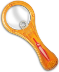 Praktische loep van milieuvriendelijk ABS-plastic met een extra, ingevoegde lens – ideaal voor kleine ontdekkers vanaf 6 jaar. Dankzij het handvat, dat opent als een kompas, kun je de loep comfortabel op tafel zetten en handsfree gebruiken. In het handvat zit bovendien een uitneembare pincet voor het makkelijk hanteren van kleine objecten. Grote lens 60 mm, kleine lens 13 mm, vergroting 3× en 7×, milieuvriendelijk materiaal, mix van kleuren.