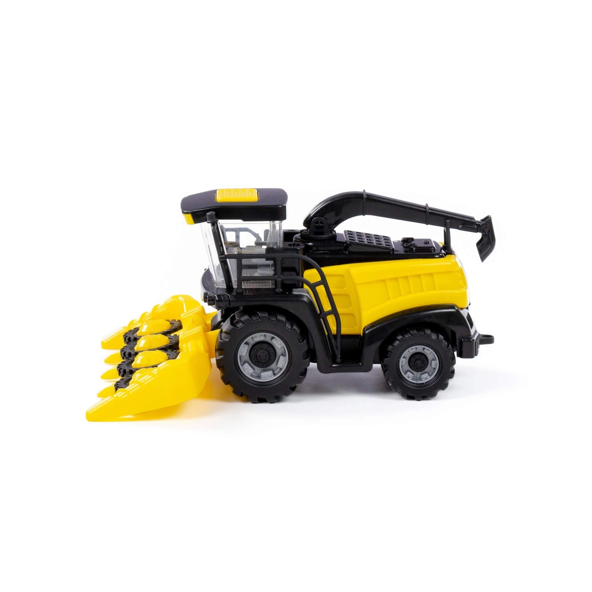 Een kinderspeelgoed-combine met vliegwielaandrijving in een aantrekkelijke gele kleur, perfect voor kleine boeren. Biedt inertiële aandrijving, een transparante cabine met gesimuleerde bedieningselementen en een verstelbare hoogte met een draaibare uitlaatpijp voor nog realistischer spel.