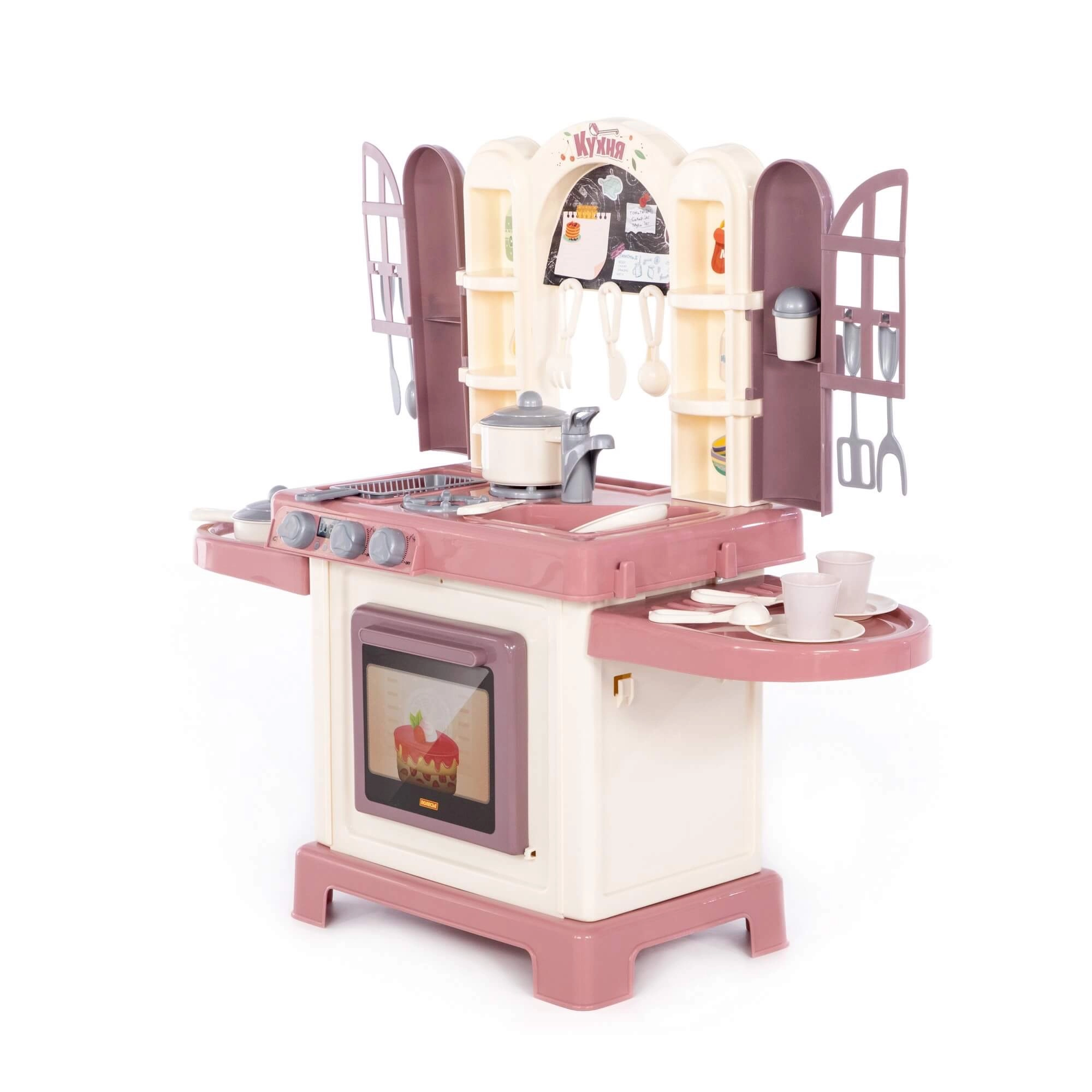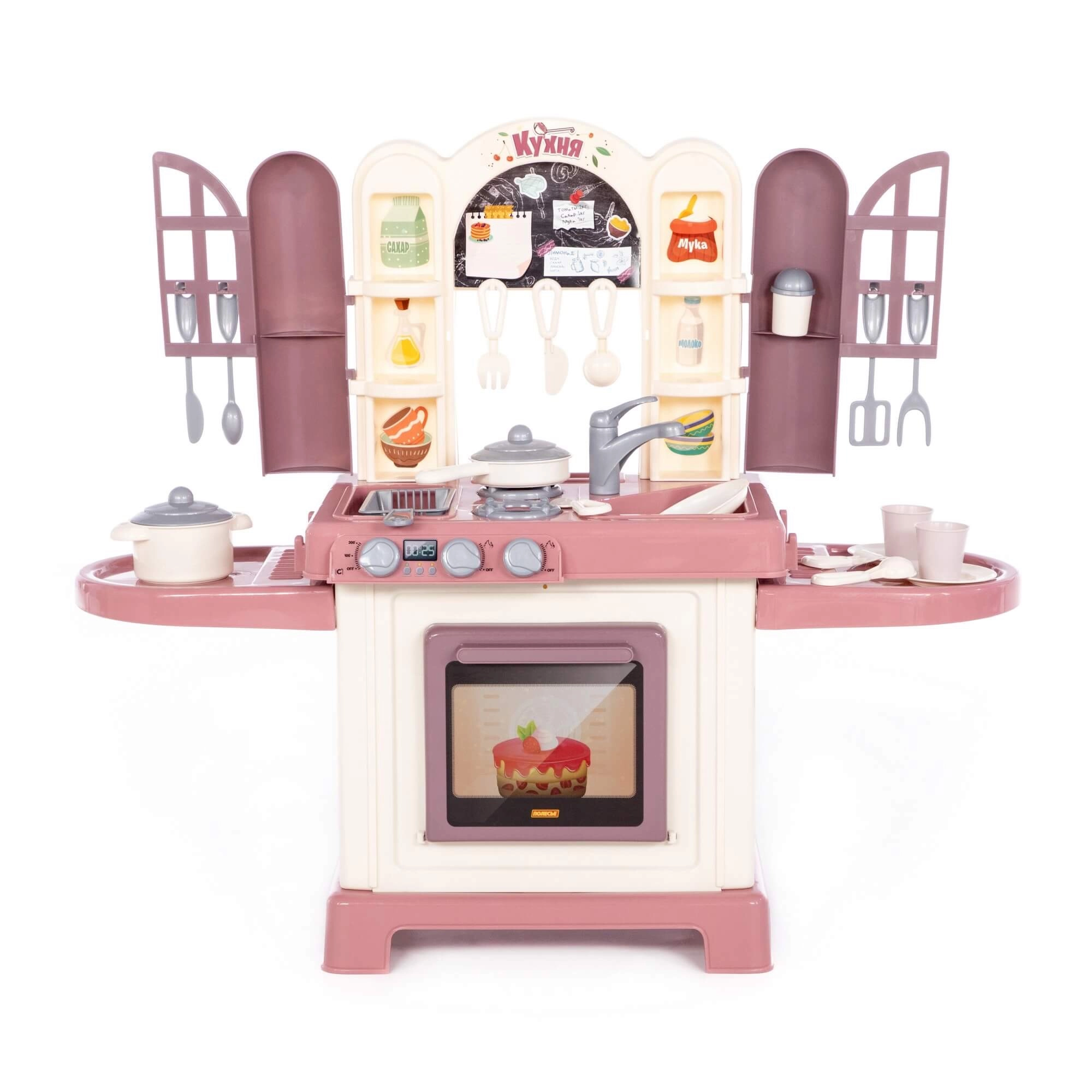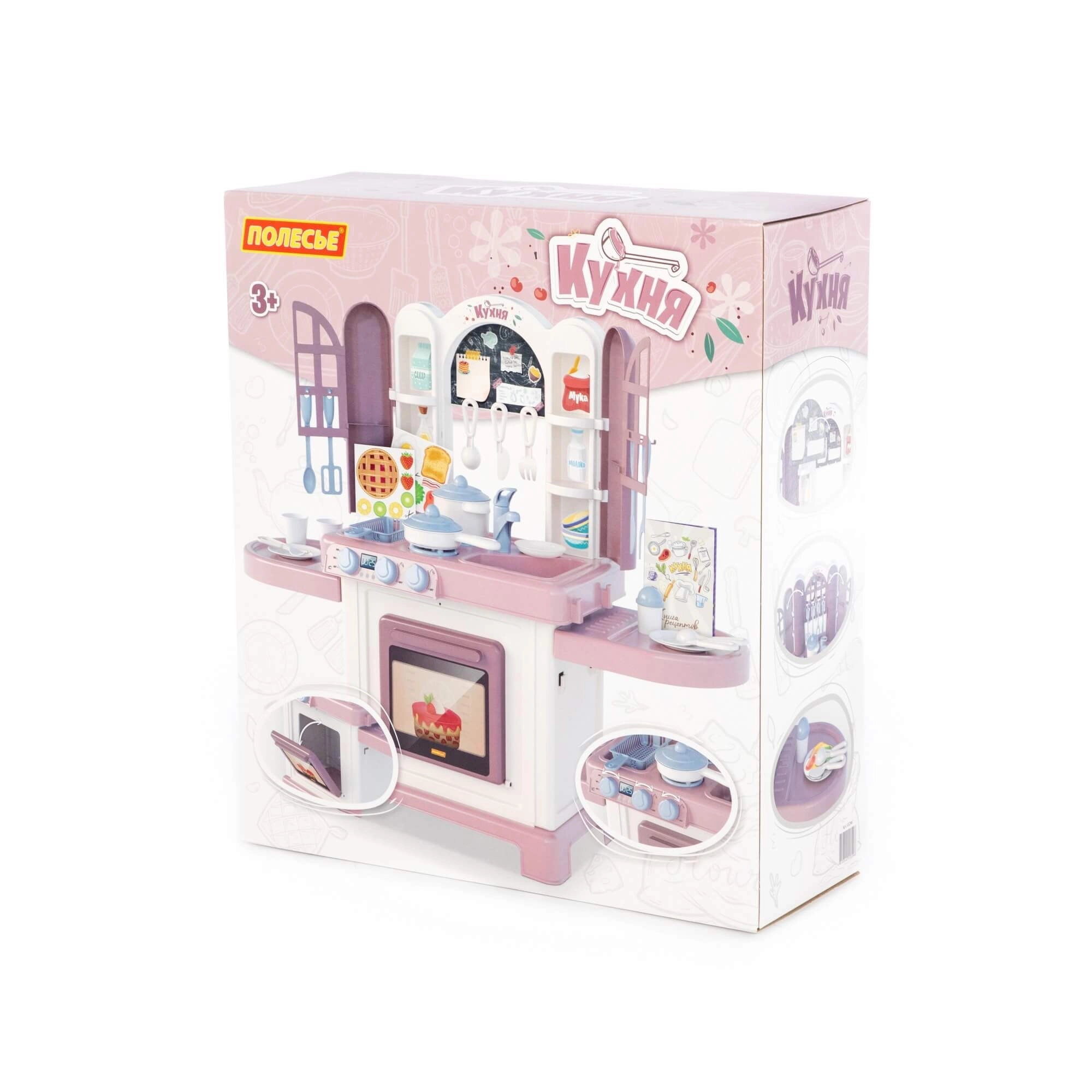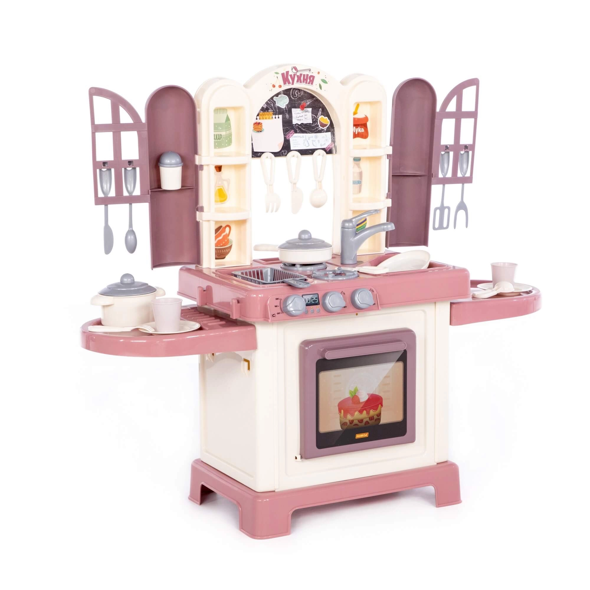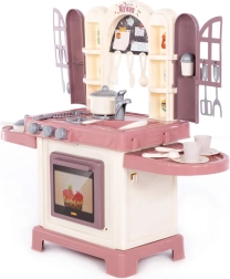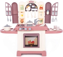 De kinderkeuken Natali roze is een speelset die een echte keuken natuurgetrouw nabootst. Kinderen kunnen koken op het fornuis met branders, bakken in de oven en afwassen in de spoelbak. Deurtjes met raampjes en praktische planken geven het spel een realistische touch en zorgen voor overzichtelijke opslag van keukengerei.