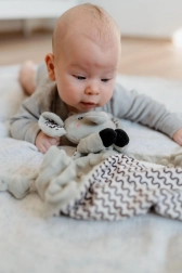 De geïntegreerde rammelaar klinkt zachtjes en ondersteunt de gehoorontwikkeling, terwijl de zachte siliconen bijtring verlichting biedt aan gevoelig tandvlees bij de eerste tandjes. Het doekje is ideaal voor het slapen, in de kinderwagen en op reis.