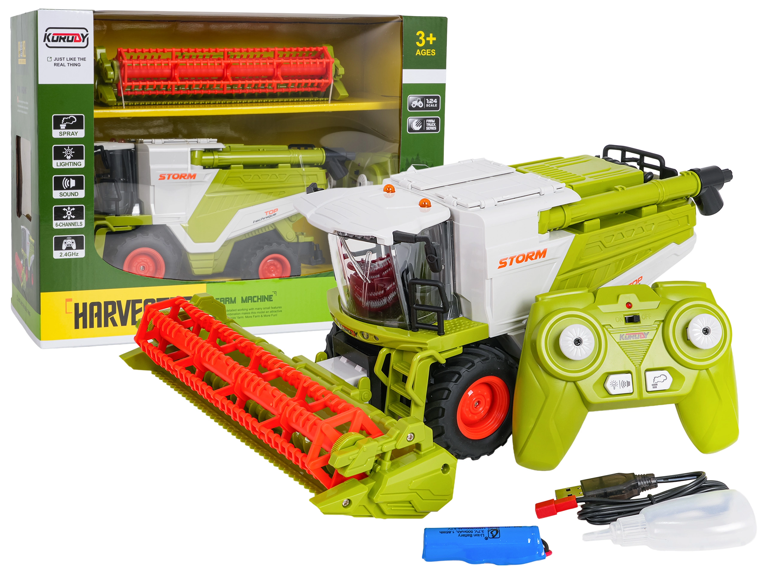 Realistische RC maaidorser op schaal 1:24 die jonge boeren vanaf 3 jaar zal enthousiasmeren. Biedt rijden in alle richtingen, rubberen wielen met goede grip, draaibare maaikorf, openbare graantank en LED-verlichting. Dankzij het rookeffect (waterdamp) en realistische geluiden voelt hij als een echte machine. Bediening via 2,4 GHz, met de mogelijkheid om licht en geluid uit te schakelen en automatische slaapstand om de batterij te sparen.