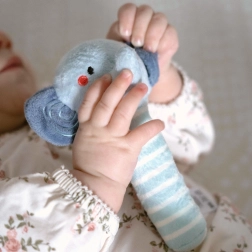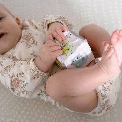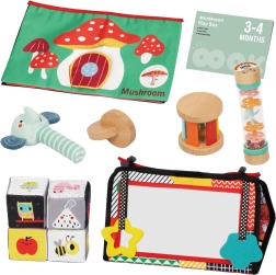Inhoud: zachte actieve blokken (4 stuks) met belletjes, een houten roterende schijf om te grijpen en te rollen, een hoog-contrast “mysteriespiegeltje” voor tummy time, houten kleurrijke rammelaars/rollers, een regenbuis met balletjes en een zacht rammel-speenbijt speeltje in de vorm van een dier. De set is ideaal als cadeau voor kersverse ouders – biedt gevarieerde sensorimotorische stimulatie en rustig, geconcentreerd spel.