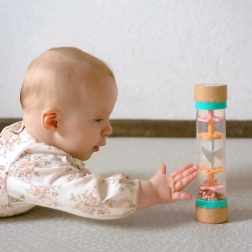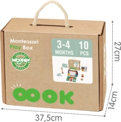 Deze zorgvuldig samengestelde Montessori-box bevat 6 didactische hulpmiddelen die het natuurlijke leerritme van de baby ondersteunen. Contrasterende patronen en de spiegel stimuleren het zicht, zachte textielen en hout ontwikkelen de tastzin en zacht gerammel of “regen” in de buis prikkelt het gehoor. Alles is ontworpen om het kind te motiveren tot grijpen, verplaatsen, rollen en de eerste ontdekkingen van oorzaak en gevolg.