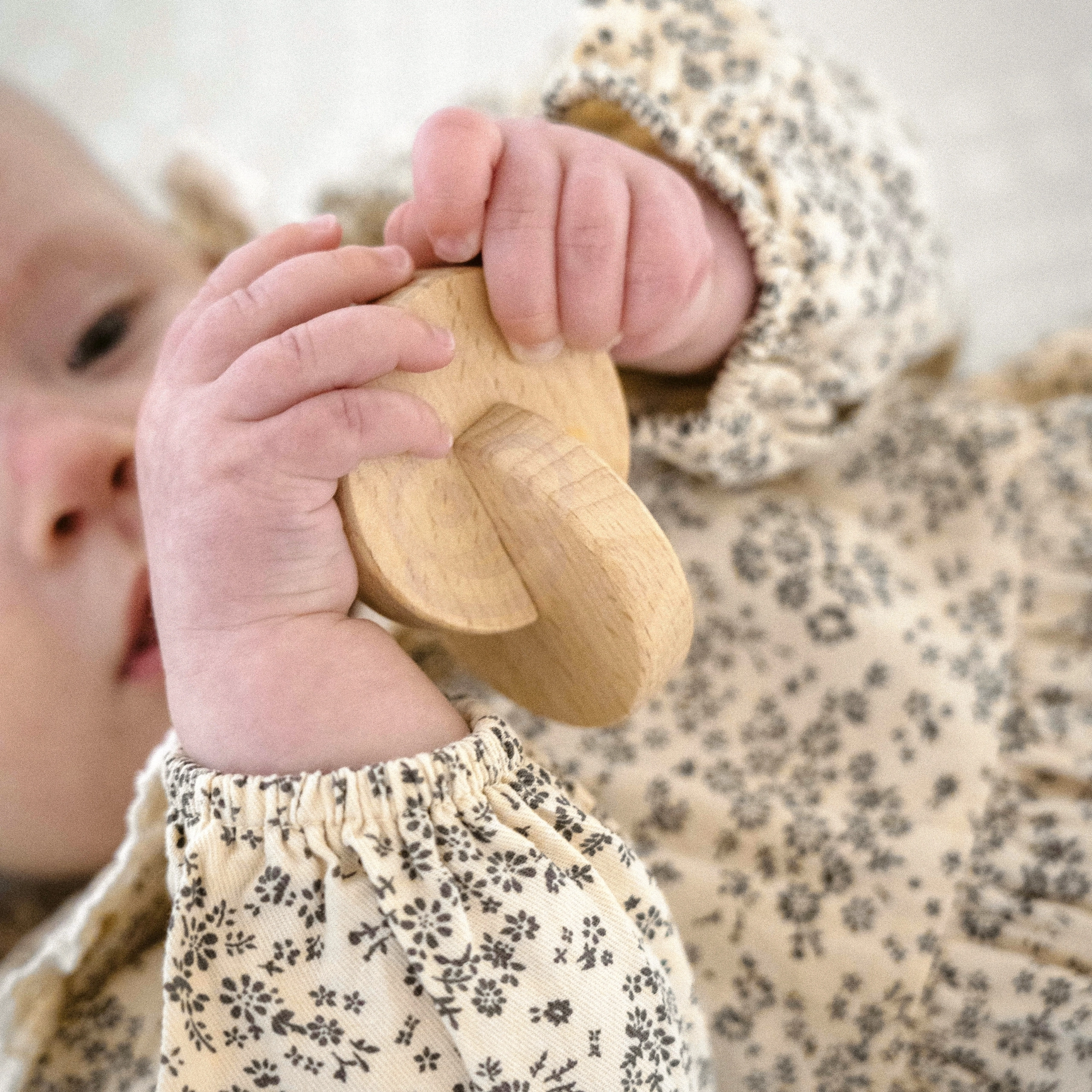 Ergonomisch gevormde houten elementen en kleurrijke rollende rammelaars ontwikkelen de greep, oog-handcoördinatie en het begrip van oorzaak en gevolg tijdens rollen en schudden.