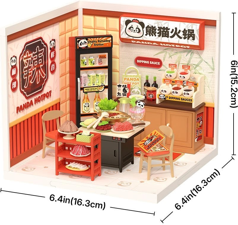 Geniet van de sfeer van een bruisend Aziatisch restaurant in miniatuur. De set bevat verfijnde details – van dunne plakjes vlees, verse groenten en paddenstoelen tot knoflookpasta, oestersaus en lente-ui. LED-licht geeft het model een authentieke avondgloed en maakt het een opvallende decoratie voor woonkamer, studeerkamer of kinderkamer.