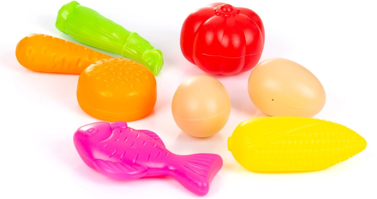 De set bevat realistische mock-ups van fruit en groenten in heldere kleuren, die helpen bij het herkennen van vormen en creatief rollenspel stimuleren.
