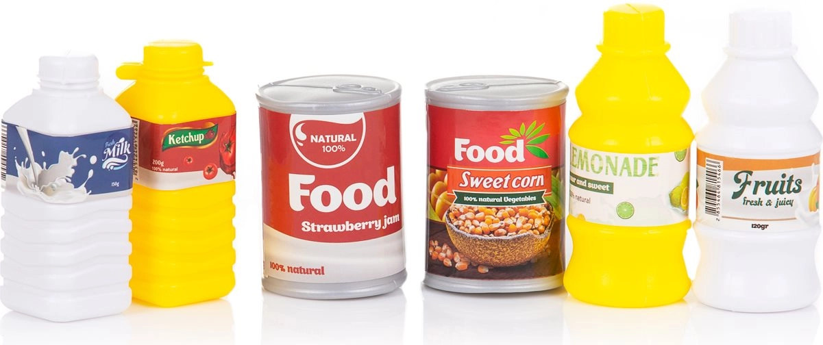 Papieren voedseldoosjes en kinderflesjes en -blikjes geven het spel authenticiteit – ideaal voor het maken van boodschappenlijstjes en het sorteren van etenswaren.