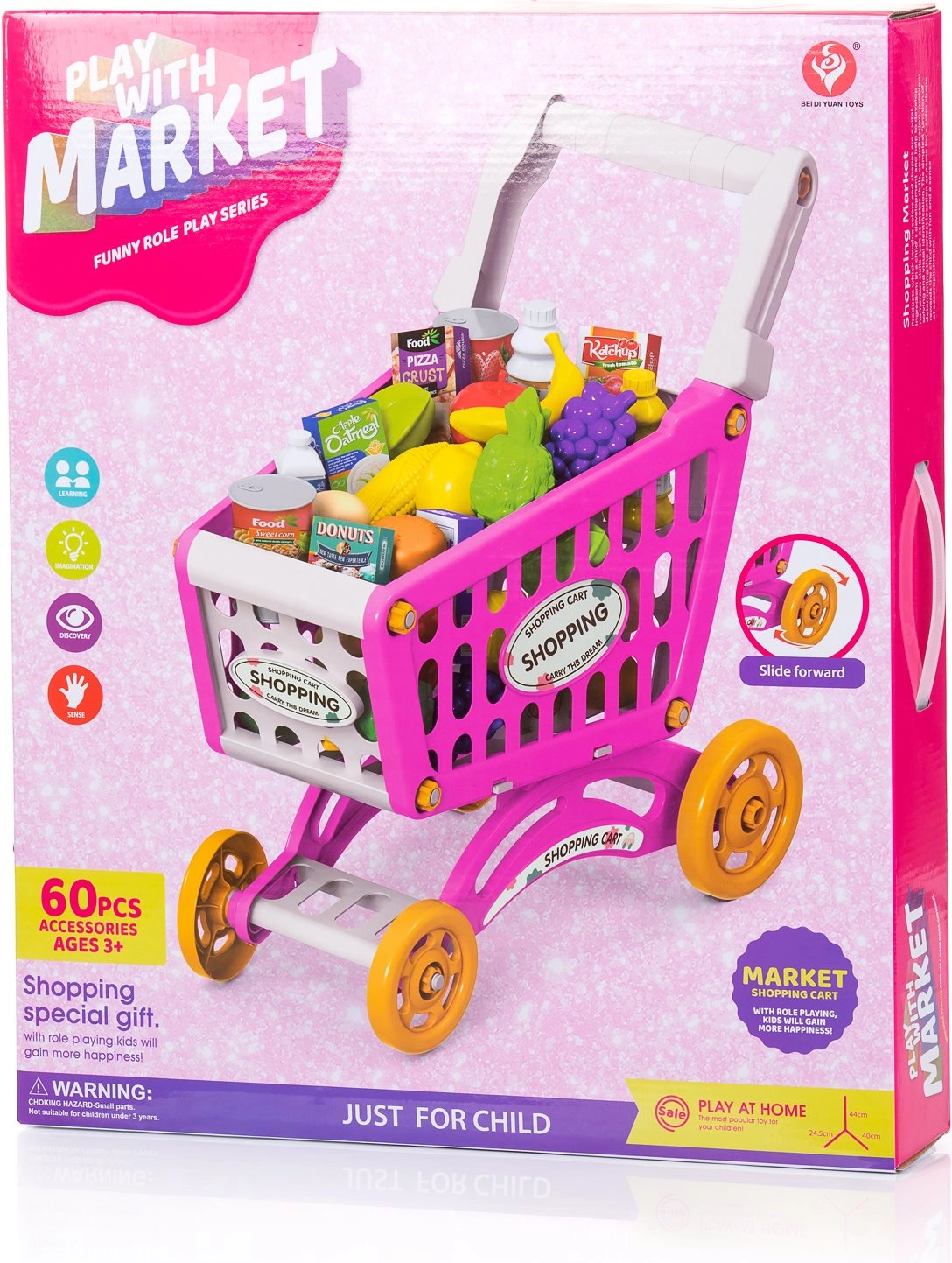 De lichte plastic wagen met een comfortabel handvat en zwenkwieltjes is ideaal voor kleine handjes. Het open mandje biedt gemakkelijk ruimte voor alle kinderboodschappen.