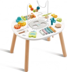 Op het tafelblad ontdekken kinderen diverse stations: een draadkralenlabyrint, xylofoon met stokje, draaibare tandwielen, magnetisch visspel, vormenstoof en andere slimme elementen om logica, geduld en coördinatie te trainen. Dankzij meerdere activiteiten op één plek blijft de speelhoek overzichtelijk en kunnen kinderen zich gemakkelijk concentreren.