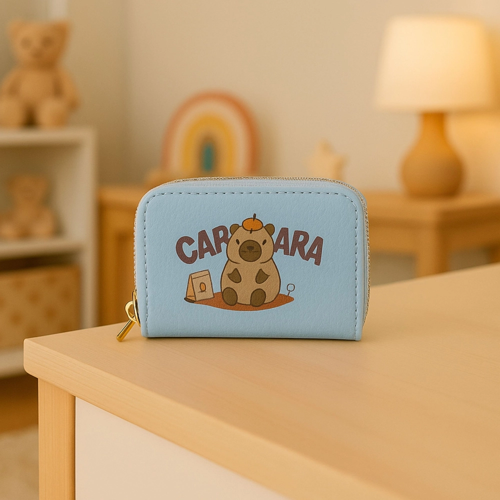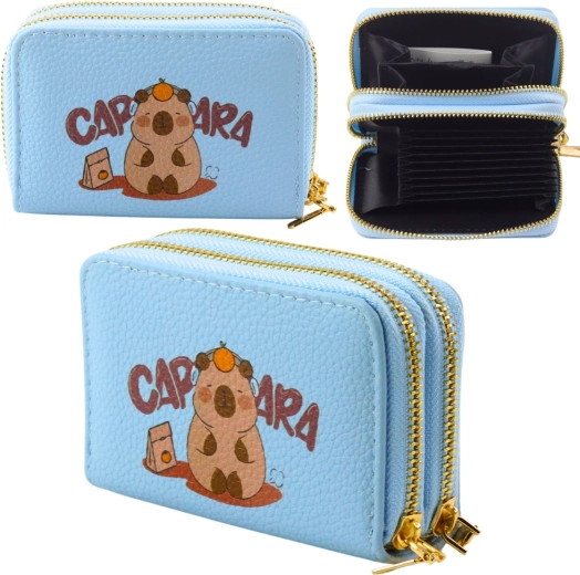 Deze lichtblauwe portemonnee combineert een speels capibara-ontwerp met praktische organisatie. Twee gouden ritsen scheiden de opbergruimte, zodat je kaarten, contant geld, muntjes en bonnetjes makkelijk kunt ordenen. De interne harmonica-constructie zorgt voor snel overzicht en comfortabele toegang.