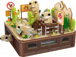 Cactussen, rotsen en decoratieve bordjes creëren een indrukwekkend tafereel op een bruine voet met transparante elementen.