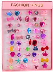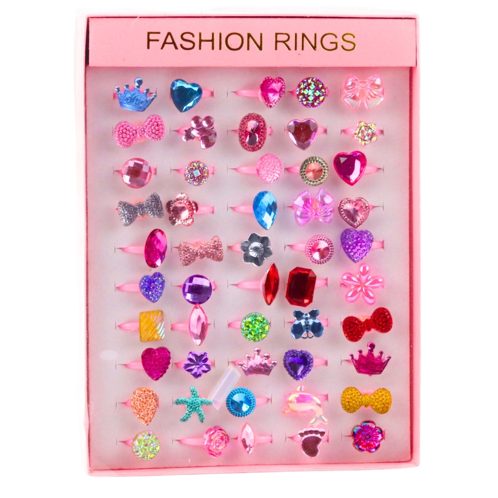 Speelset vol fantasie: 50 kleurrijke ringetjes met motieven van hartjes, sterretjes, kroontjes, strikjes, bloemetjes en grote “kristallen” bezorgen elke kleine liefhebber van sieraden plezier. De glanzende gefacetteerde steentjes weerkaatsen prachtig het licht en geven elke verkleedoutfit en het dagelijks spel een unieke schittering.