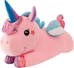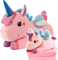 Schattige pluchen 3-in-1 eenhoorn die een knuffelspeeltje, een zacht kussentje en een warme fleecedeken van 160 × 110 cm combineert. Rits de buik open en haal de deken eruit – ideaal om te slapen, te reizen en te ontspannen. Zacht, huidvriendelijk pluche en een betoverende look met kleurrijke hoorn en vleugeltjes zorgen voor comfort en speelplezier.
