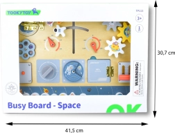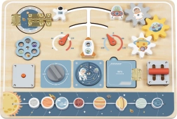 Ga op ruimtemissie met het interactieve houten bord van Tooky Toy, dat Montessori-principes combineert met creatief spel. De kleurrijke motieven van planeten, raketten en astronauten en de vele manipulatieve elementen ontwikkelen de fijne motoriek, logica en verbeelding van kinderen vanaf 3 jaar.