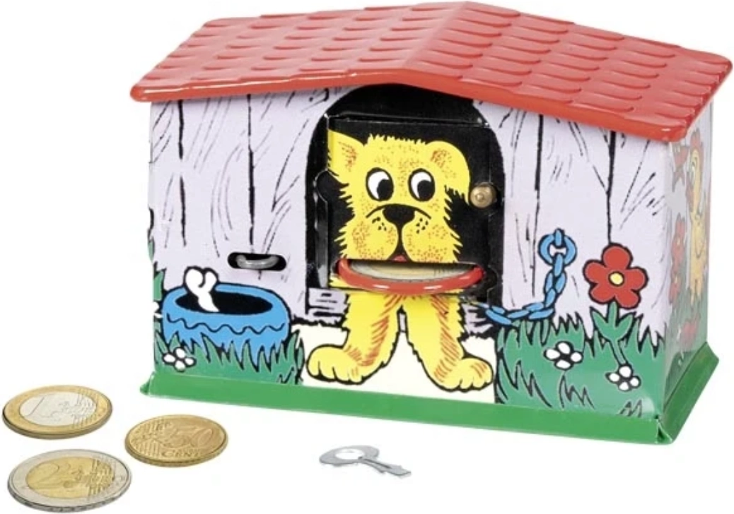 Deze stijlvolle spaarpot in de vorm van een hondenhok is een geweldig cadeau voor kinderen en dierenliefhebbers. De metalen behuizing met kleurrijke print en rood dak oogt speels en is tegelijk sterk genoeg voor dagelijks gebruik. De muntsleuf maakt het inwerpen eenvoudig en het kleine deurtje met slotje zorgt voor veilig uitnemen van het spaargeld.