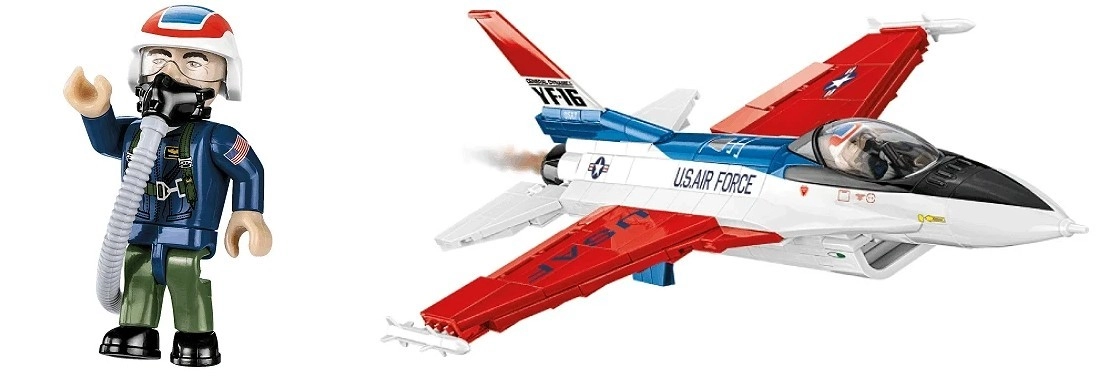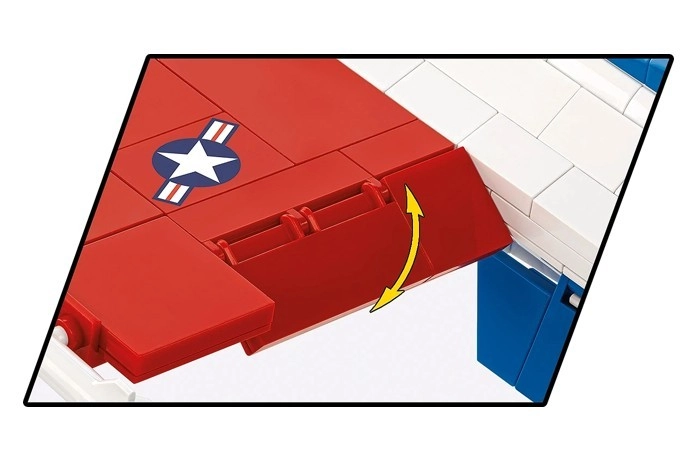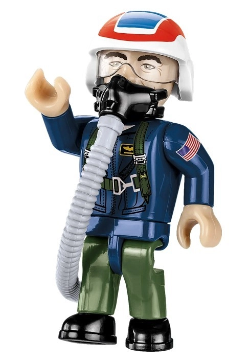 Bijgevoegd zijn een pilotenminifiguur in testpak met helm en slang van het zuurstofmasker, een te openen canopy, bewegende onderdelen van rolroeren en wielen, en een robuuste standaard met naam en schaal. Alle elementen hebben duurzame prints zonder stickers en zijn compatibel met andere bouw merken.