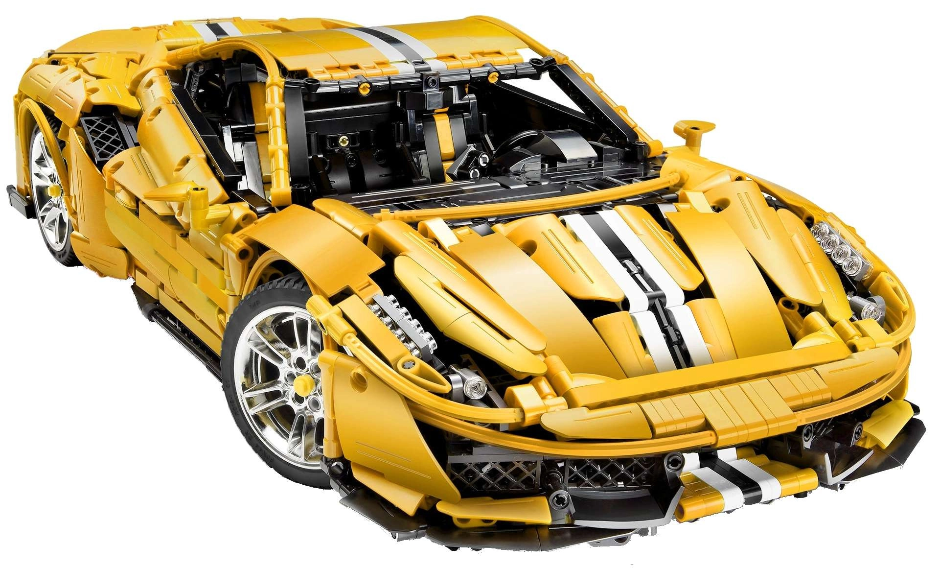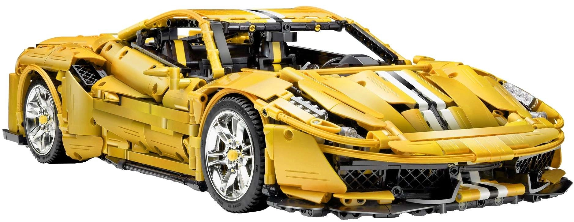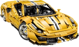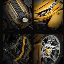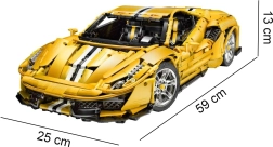 Dit monumentale model van een gele supersportwagen blinkt uit door realistische vormen, rijke details en technische functies die zowel ervaren bouwers als techniekliefhebbers zullen bekoren. Met de 2,4 GHz RC-controller rijdt de auto vooruit/achteruit, verander je de snelheid en schakel je de LED-verlichting in of uit. De onafhankelijke wielophanging met schokdempers en de functionele besturing gekoppeld aan het stuur zorgen voor een authentieke beleving.
