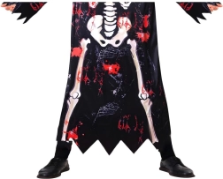 De lange zwarte mantel met skeletprint en rafelige randen zorgt voor een opvallend effect dat meteen in het oog springt.