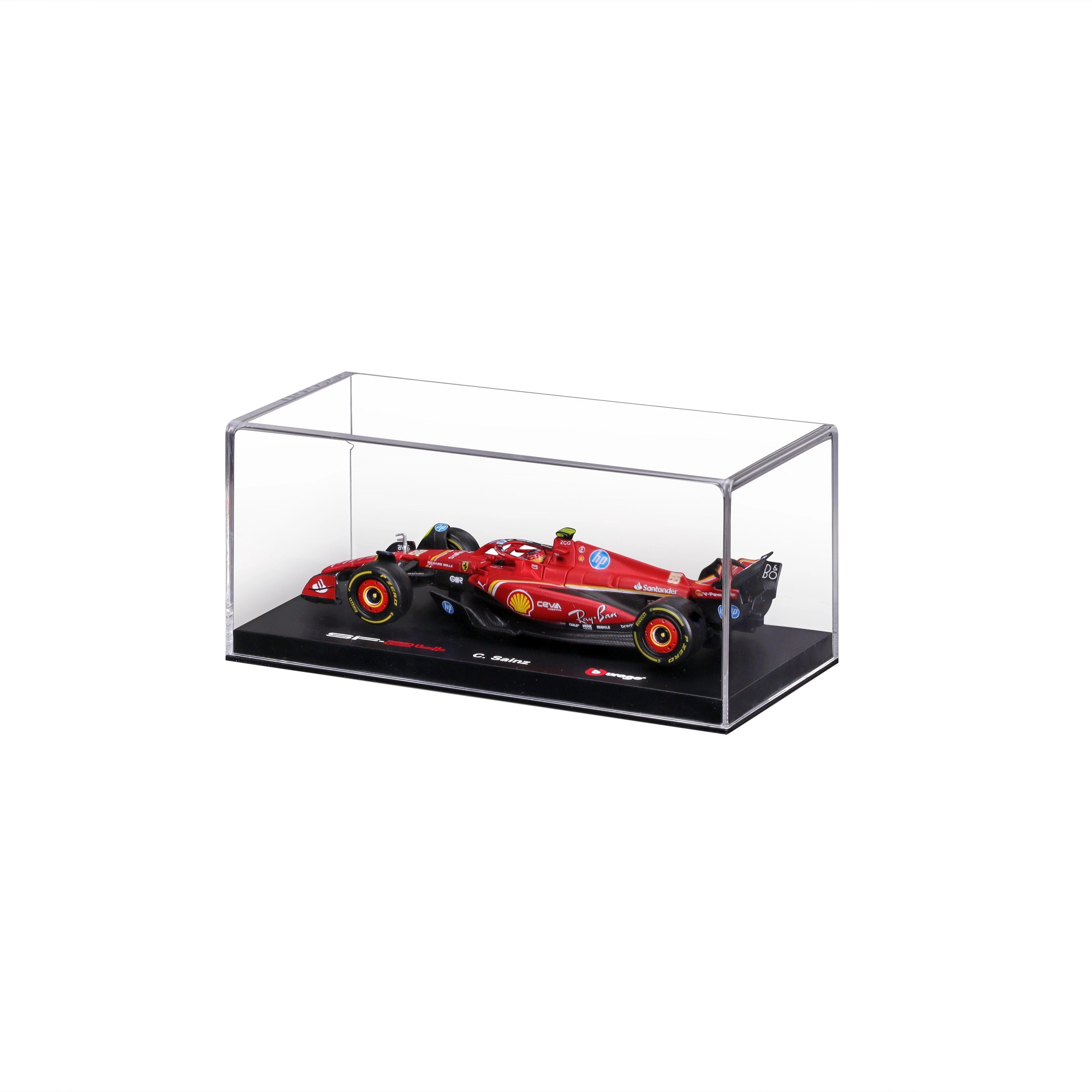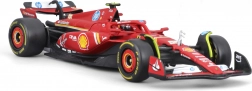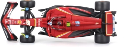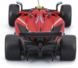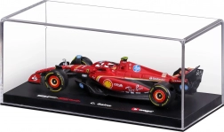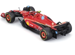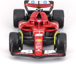 Getrouwe proporties van de Ferrari SF-24 met sponsorlogo’s, aerodynamische vleugels en cockpitdetails met coureur Carlos Sainz.