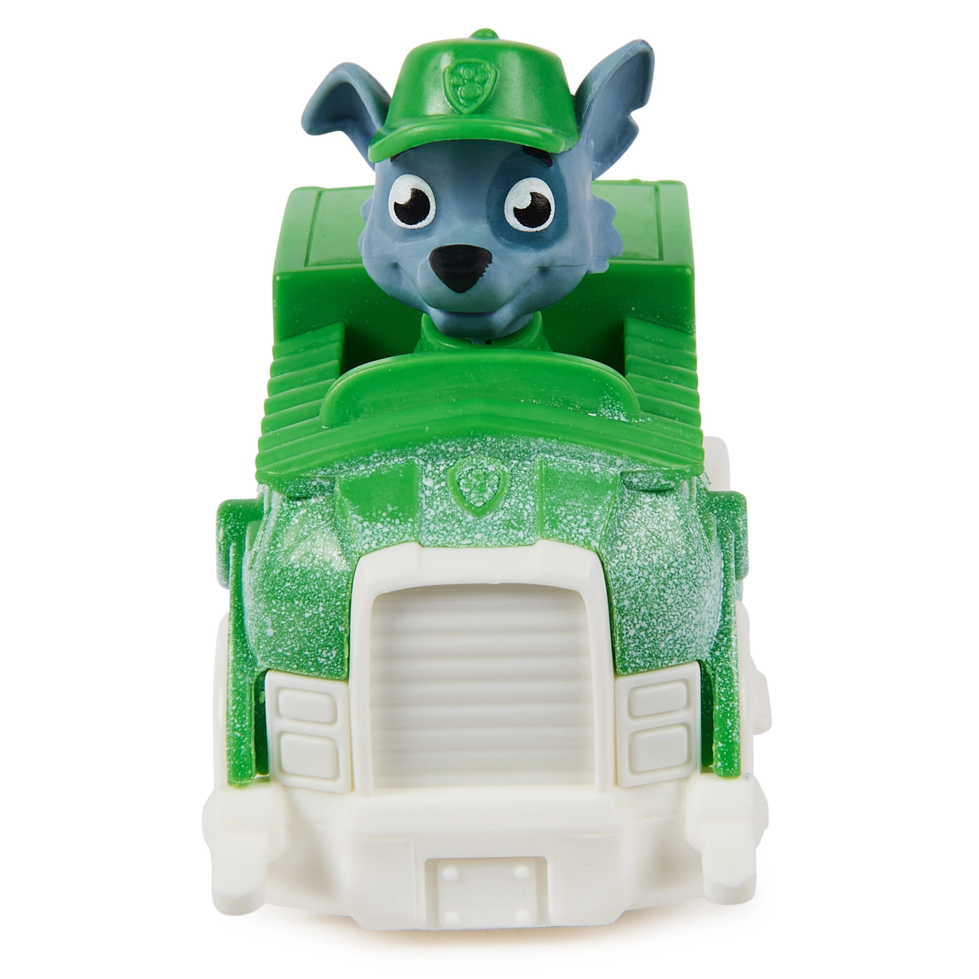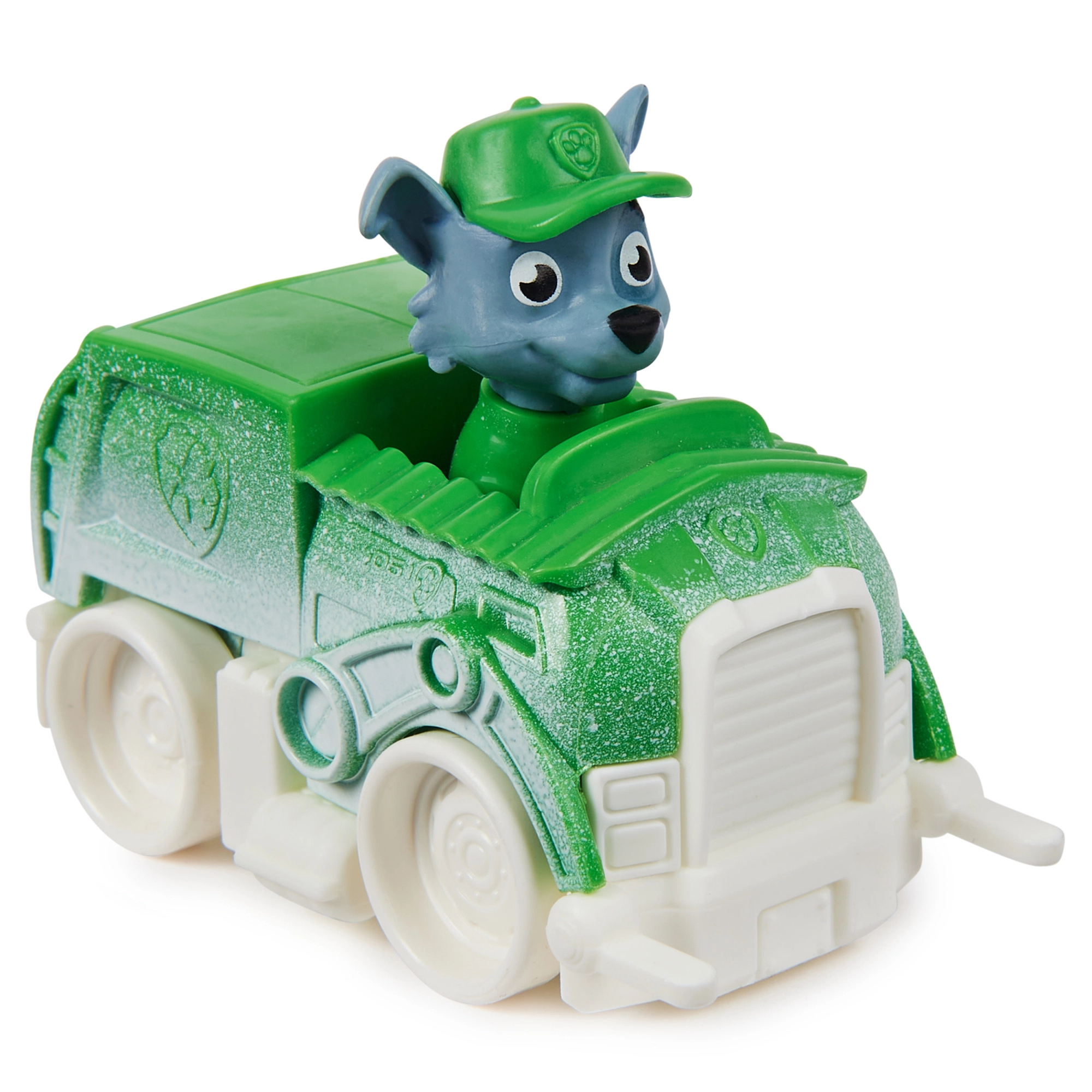 Dit compacte voertuig van Rocky uit de serie PAW Patrol is ideaal voor jonge fans die van winterse avonturen houden. De groene recyclingtruck met sneeuweffect biedt authentieke details, waaronder voorvorken voor het verplaatsen van lading en een stevig vastgezet Rocky-figuurtje met helm. De speelgoedauto is ontworpen voor push-along rijden – gewoon een duwtje geven en op pad.