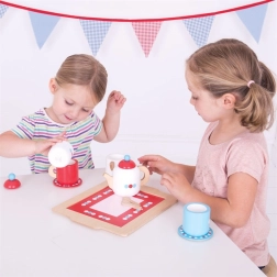 Een theekransje spelen ontwikkelt communicatie, samenwerking en fantasie. Kinderen oefenen grijpen, precisie en coördinatie terwijl ze hun eigen verhalen en rituelen creëren. Het elegante stippenontwerp in rood, blauw en wit fleurt elke speelhoek op.
