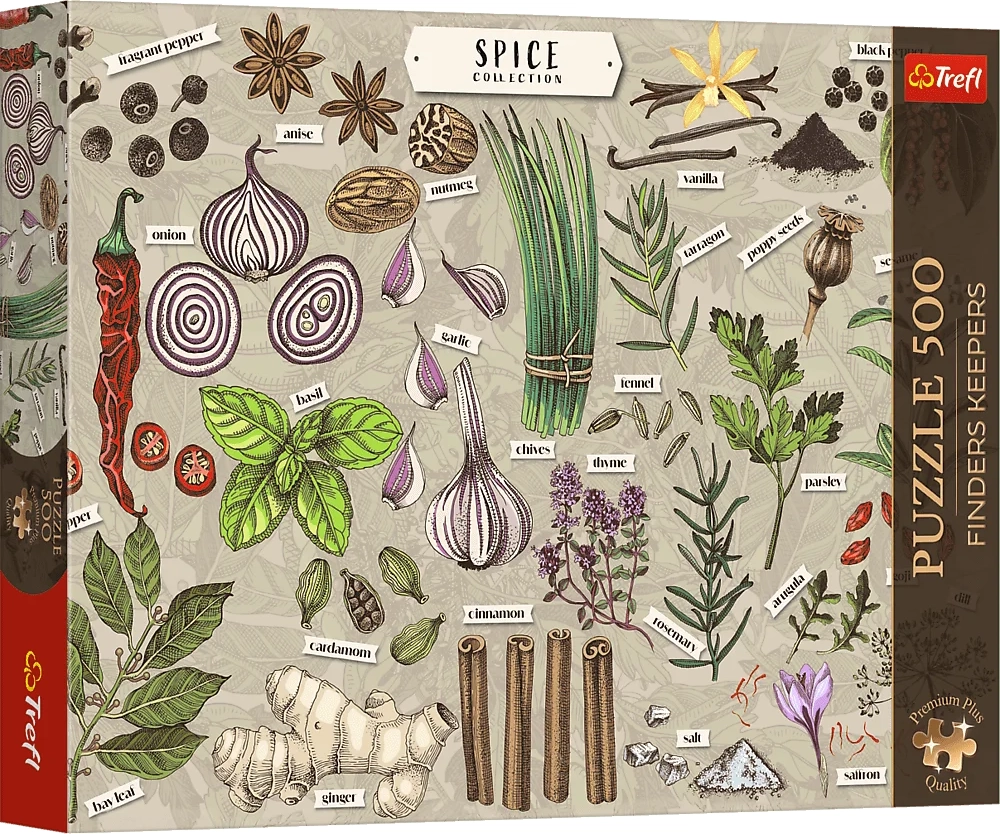Duik in de wereld van smaken met het motief Finders Keepers: Kruiden, dat doet denken aan een culturele kaart vol kruiden, groenten en specerijen. De TREFL Premium Plus-serie biedt precisie-afwerking, moderne verpakking en zorgvuldig geselecteerde afbeeldingen die opvallen door kleur en sfeer.