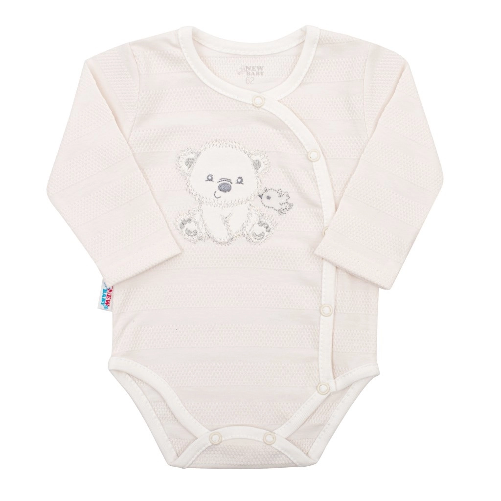 Deze elegante newborn-set New Baby Sweet Bear is ontworpen voor maximaal comfort en veiligheid van de baby. Zachte, ademende 100% katoen is mild voor de gevoelige huid en voert vocht uitstekend af. De neutrale beige uitvoering met subtiele texturen en een lief borduursel van een beertje met een vogeltje is geschikt voor zowel meisjes als jongens.