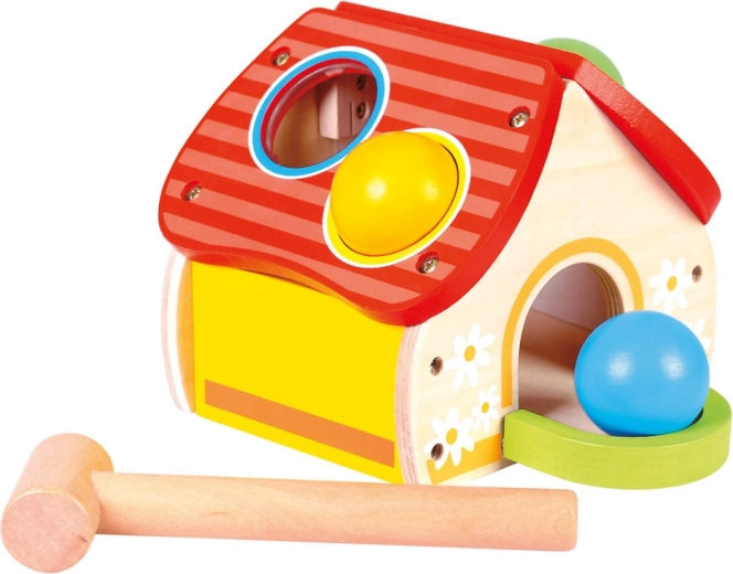 Deze kwalitatieve houten speelgoedset in de vorm van een vrolijk huisje spreekt kinderen aan met heldere kleuren en een eenvoudig spelprincipe – de balletjes worden in de openingen op het dak gelegd en met het hamertje zachtjes ingeklopt. Het spel ondersteunt de ontwikkeling van motoriek, geduld en nauwkeurigheid.