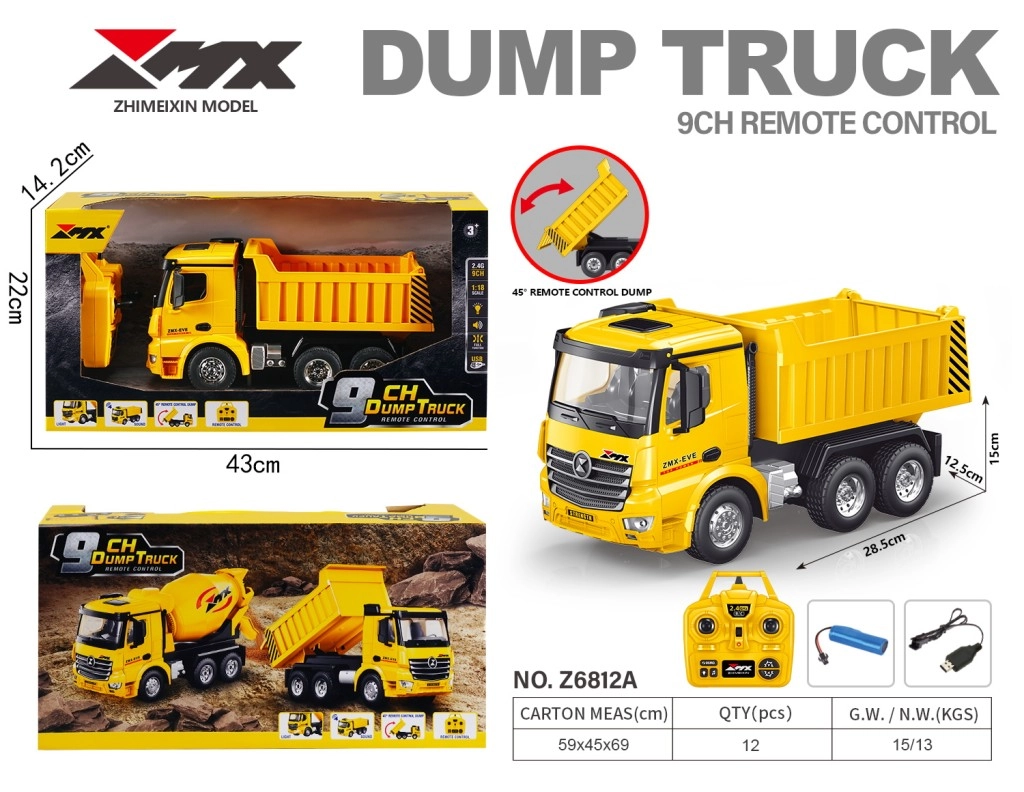 De 2,4 GHz-afstandsbediening garandeert een stabiele signaaloverdracht met een bereik tot 30 m en 9 kanalen voor volledige controle – vooruit/achteruit rijden, sturen en het activeren van het kiepen. Geïntegreerde licht- en geluideffecten versterken de beleving en maken het model aantrekkelijk voor zowel beginners als ervaren RC-fans.