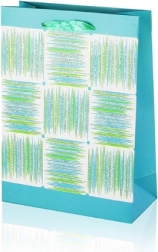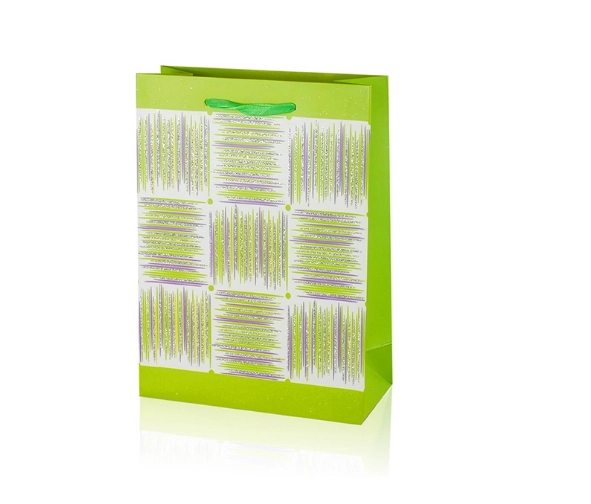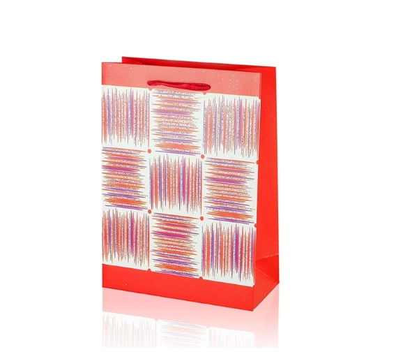 Deze A5-cadeautas combineert praktische afmetingen met een aantrekkelijk design. Het glanzende oppervlak, het decoratieve paneel met strepen en de lint-handgrepen geven je cadeau een premium uitstraling. De tas heeft vouwbare zijkanten en een stevige bodem voor stabiliteit bij het inpakken van items.