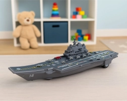 Dit gedetailleerd uitgewerkte vliegdekschip biedt kinderen spannende maritieme missies. Na het inschakelen gaan de lichten aan en klinken geluiden die de spelbeleving versterken. Dankzij de frictie-aandrijving rijdt het na een lichte duw vanzelf, wat het speelplezier en de realiteitsbeleving vergroot.