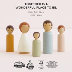 Deze houten familie is handgemaakt van hoogwaardig FSC®-hout en met ecologische verf op waterbasis met de hand afgewerkt. Het gladde oppervlak en de afgeronde vormen zorgen voor veilig spelen, terwijl de neutrale kleurtinten en eenvoudige vormen de verbeelding en het creatieve vertellen van verhalen stimuleren.