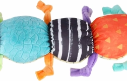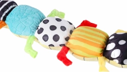 Knisperpapier, piepertje en rammelaar stimuleren gehoor en tast, terwijl de kleurrijke segmenten het visuele waarnemen ondersteunen.