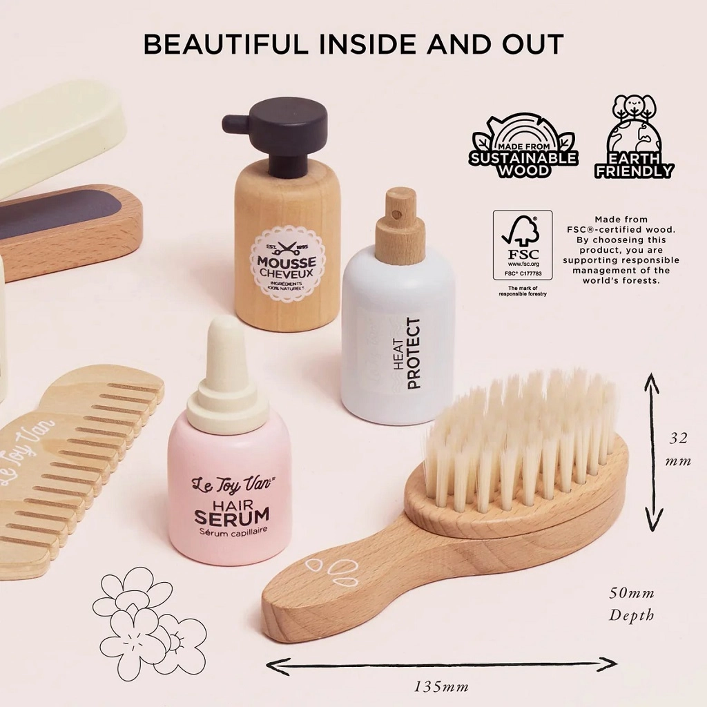 De Le Toy Van kappersset voor kinderen biedt uren creatieve speelpret voor kleine stylisten. Bevat 8 hoogwaardige houten onderdelen, waaronder een stijltang, borstel, kam en cosmetische accessoires voor fantasie-haarverzorging. Gemaakt van FSC-gecertificeerd hout, met de hand nabeschilderd met niet-giftige, watergedragen verven en voldoet aan strenge veiligheidsnormen. Stimuleert verbeeldingskracht, sociale vaardigheden en fijne motoriek bij kinderen vanaf 3 jaar.