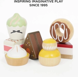 Breng een zoete sfeer in kinderspel met de elegante houten taartenstandaard van LE TOY VAN. Deze hoogwaardige toevoeging aan de kinderkeuken biedt drie etages om te serveren, 7 gedetailleerd uitgewerkte houten desserts en is gemaakt van FSC-gecertificeerd hout met niet-giftige verf op waterbasis. Hij is veilig voor kinderen, vrij van plastic en stimuleert creativiteit, verbeelding en fijne motoriek.