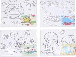 De set biedt een keuze uit geliefde thema’s: uil, walvis, slak, jongen met schepnet, octopus en bij. Elk canvas heeft duidelijke contouren en een kleine kleurenpreview voor eenvoudig afwerken.