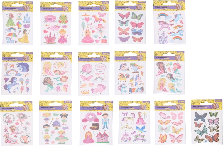 Geef je stijl een boost met tijdelijke tattoodecalcomania’s in het formaat 7,5 × 11 cm. De rijke mix van motieven zal liefhebbers van sprookjes- en natuurthema’s bekoren – van delicate feeën en zeemeerminnen tot schattige eenhoorns en elegante vlinders. De tattoo’s zijn eenvoudig aan te brengen en vervagen geleidelijk van de huid.
