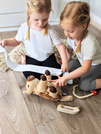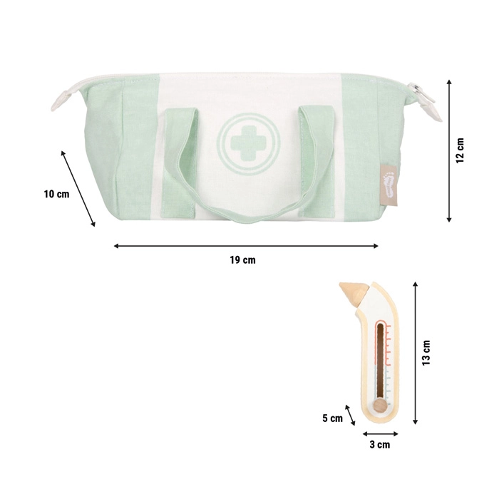 De praktische tas met rits houdt alles bij elkaar en is makkelijk mee te nemen. De verstelbare thermometer en inschuifbare spuit nodigen uit tot ontdekken en ondersteunen de oog-handcoördinatie. Beschrijfbare patiëntenkaarten met stift prikkelen de verbeelding en de eerste stapjes naar logisch denken.