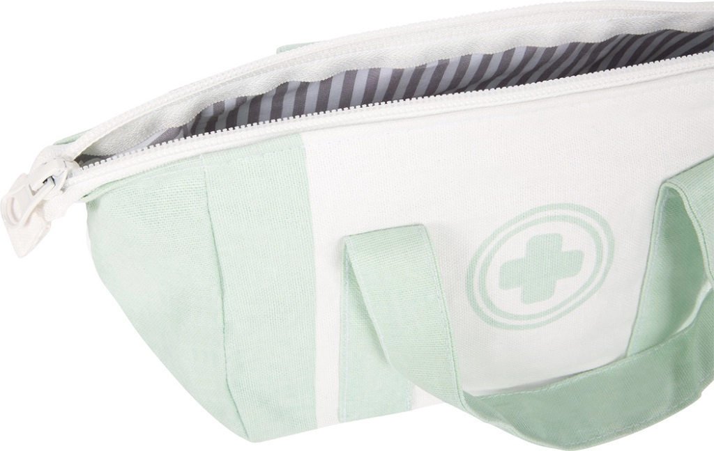 Stijlvolle doktersset voor kinderen vanaf 3 jaar in een lichte stoffen tas met handvat, met alles voor realistisch doktertje spelen: stethoscoop, inschuifbare injectiespuit, thermometer met aanwijzer, pincet, spatel, zachte klittenbandverband en beschrijfbare patiëntenkaarten met stift. Ondersteunt fijne motoriek, fantasie en sociale vaardigheden en is ideaal voor thuis en onderweg.