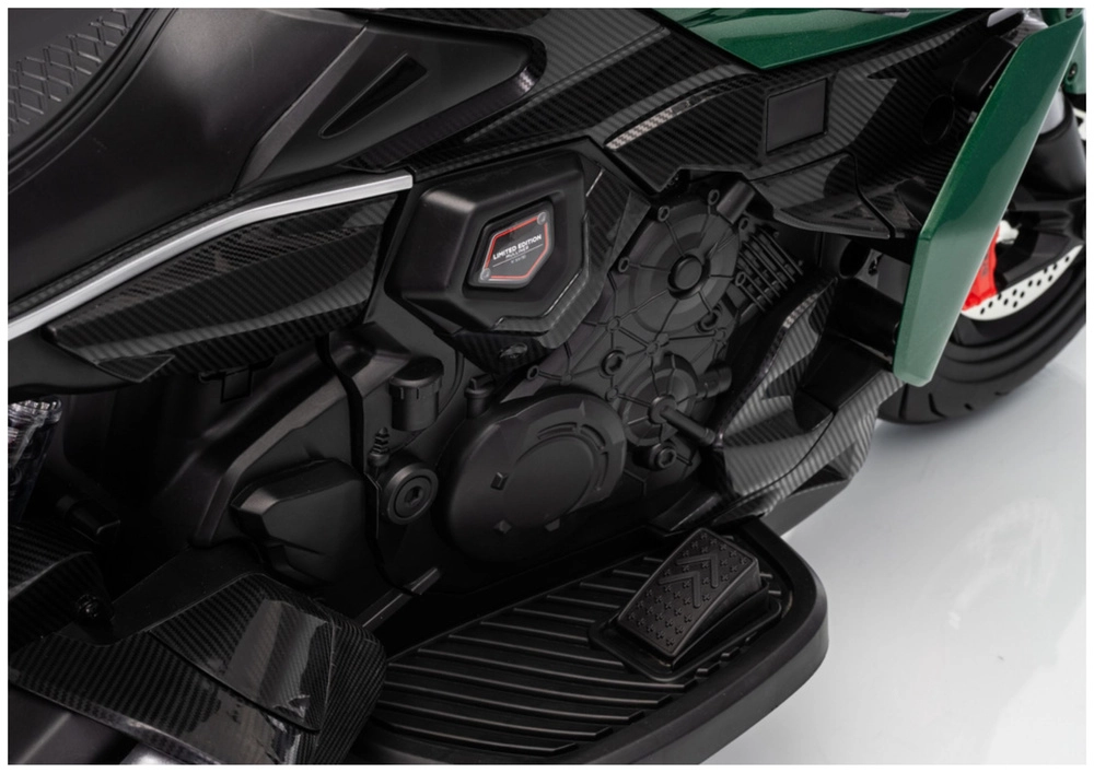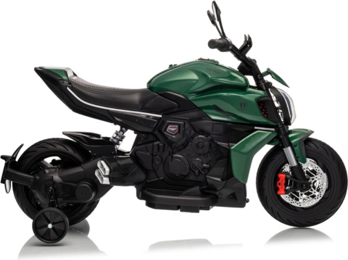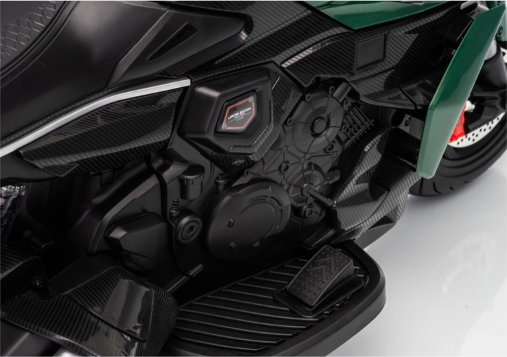 De elektrische kindermotor in het groen valt op door zijn sportieve uitstraling en veilige constructie. Dankzij de brede banden en de stabiliserende zijwieltjes voelen kinderen zich snel zeker, terwijl de heldere LED-koplamp en realistische details (achteruitkijkspiegels, remschijf-look) de echte motorervaring versterken.