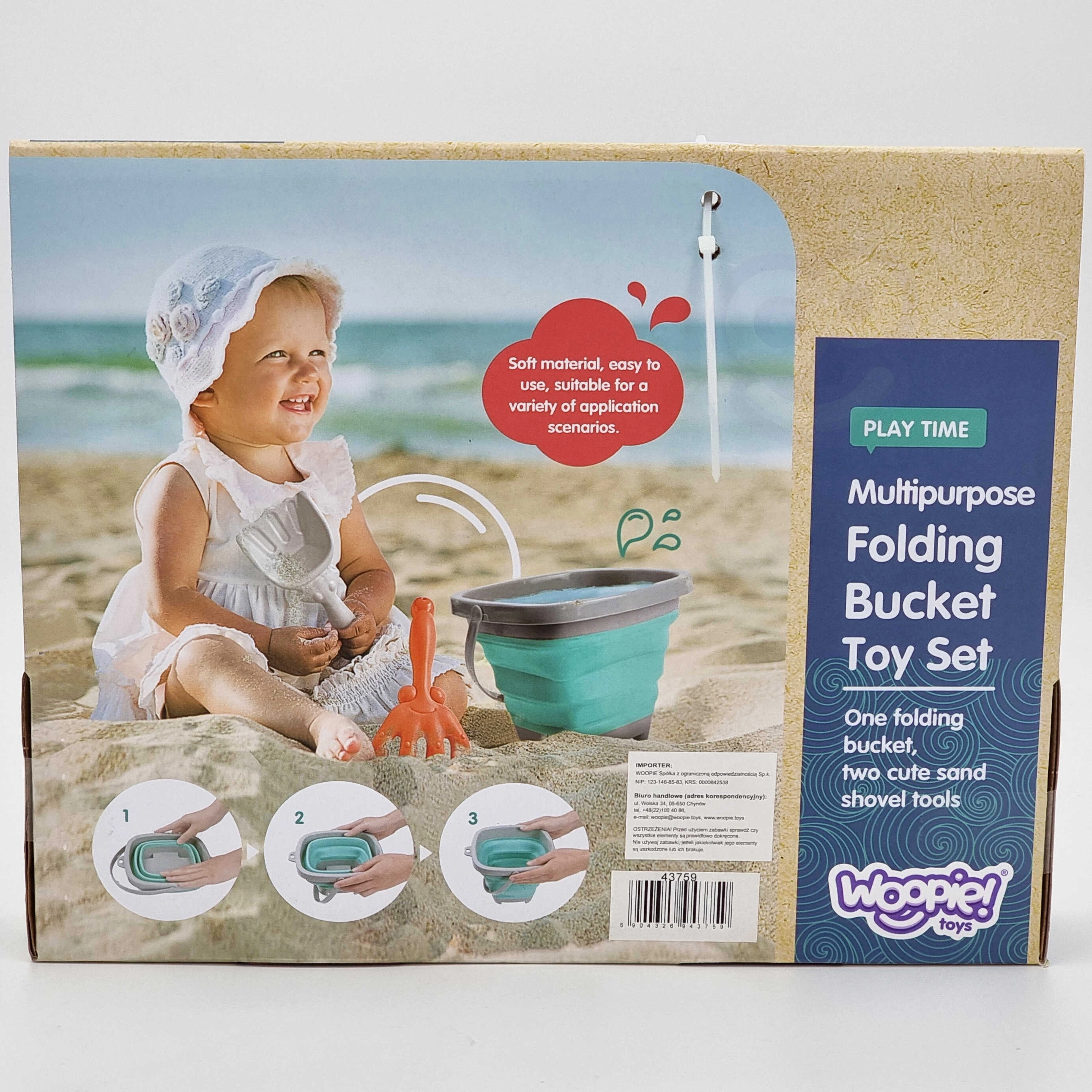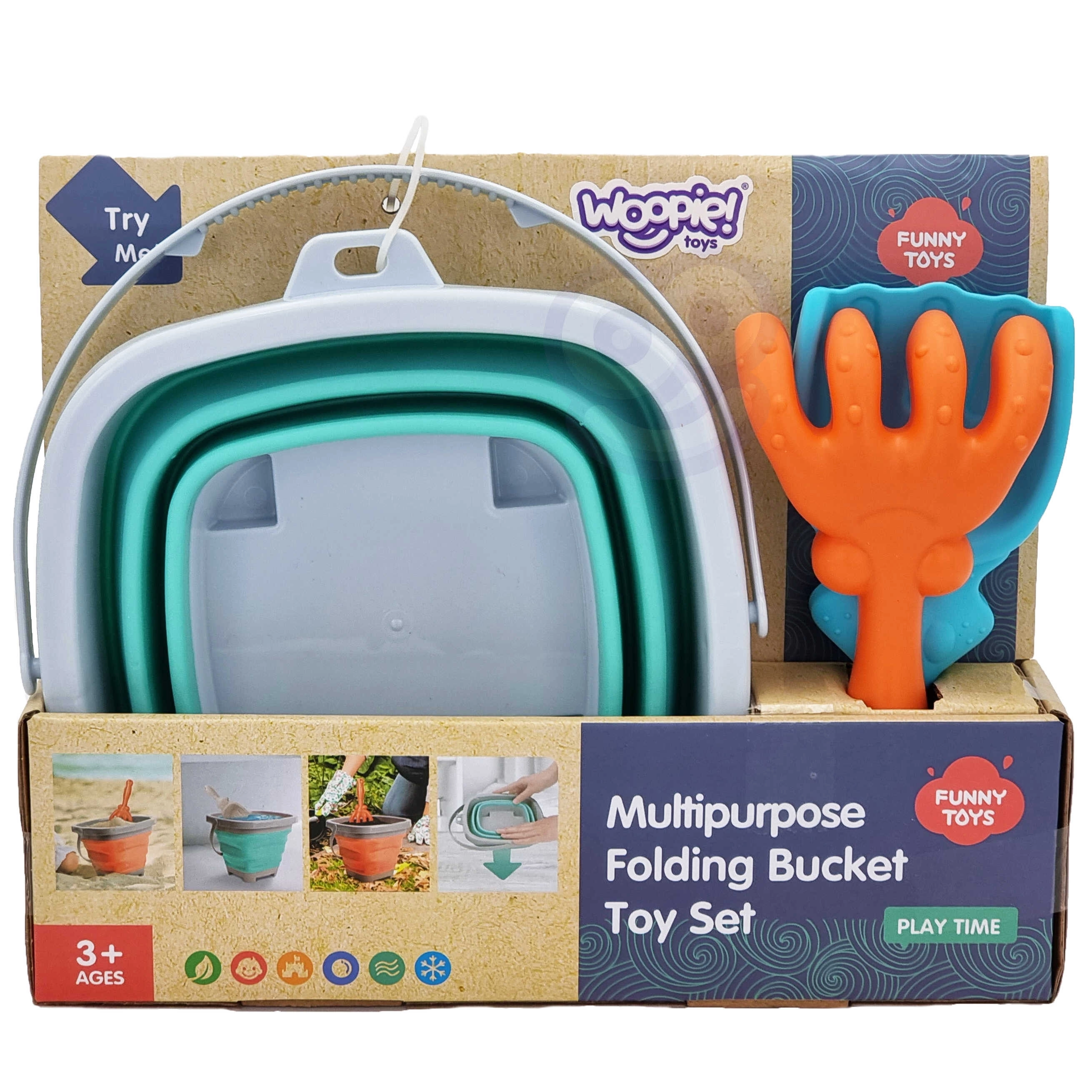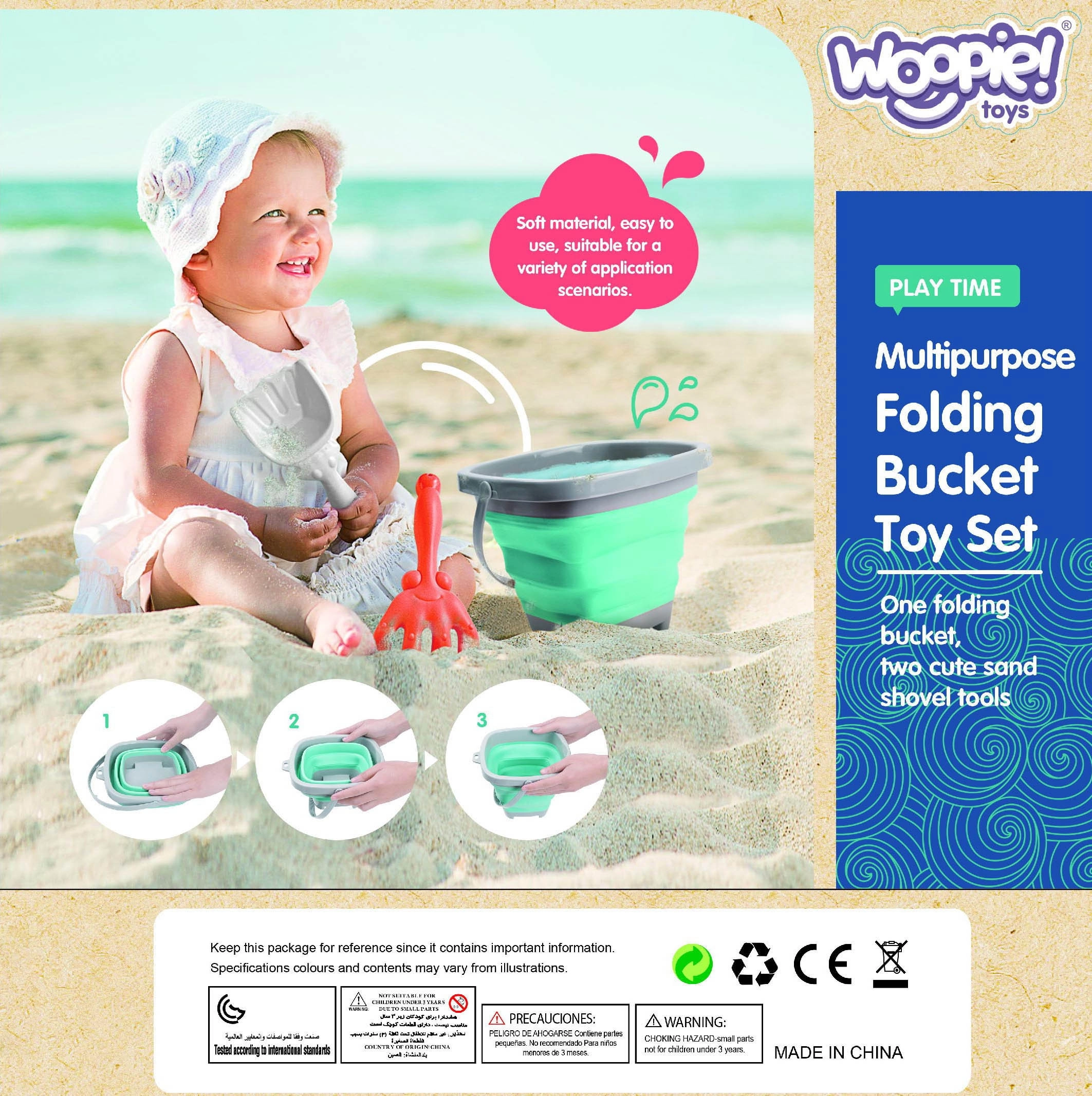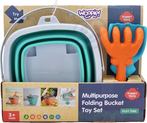 De opvouwbare WOOPIE-emmer met accessoires is een geweldige metgezel voor op vakantie en voor dagelijks speelplezier. De in accordeon gevouwen siliconen wanden maken het mogelijk de emmer snel plat te vouwen, zodat hij in een kinderrugzak, kinderwagen of strandtas past. De set bevat ook een praktische schep en hark voor het bouwen van kastelen en vormen in het zand.