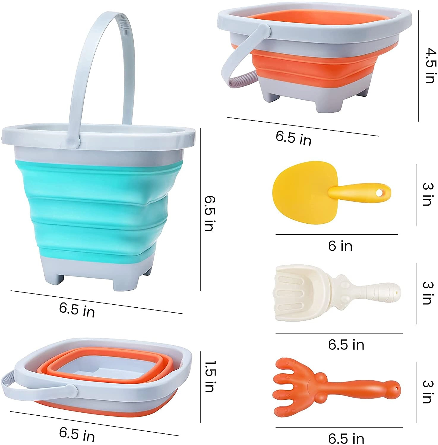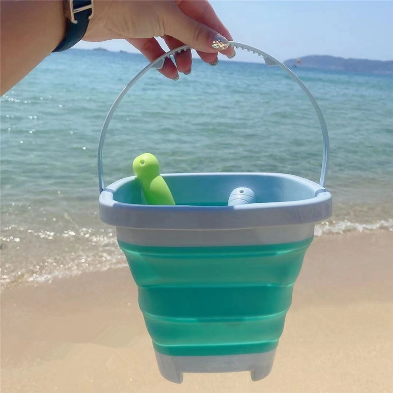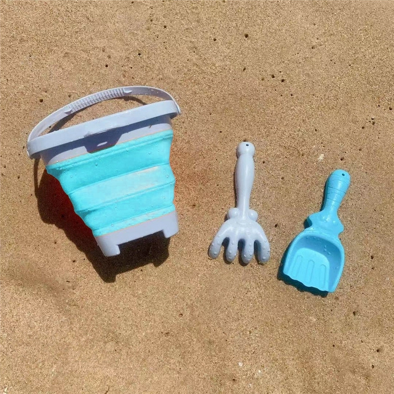 Lichte en praktische zandset voor kinderen vanaf 3 jaar: opvouwbare siliconen emmer 5 l met schep en hark. Dankzij het accordeonvouwmechanisme neemt hij minimaal ruimte in, is makkelijk mee te nemen, ideaal voor strand, zandbak en tuin en handig op te bergen. De plastic rand, bodem en handgreep zorgen voor stabiliteit, terwijl de siliconen wanden duurzaamheid en flexibiliteit bieden.