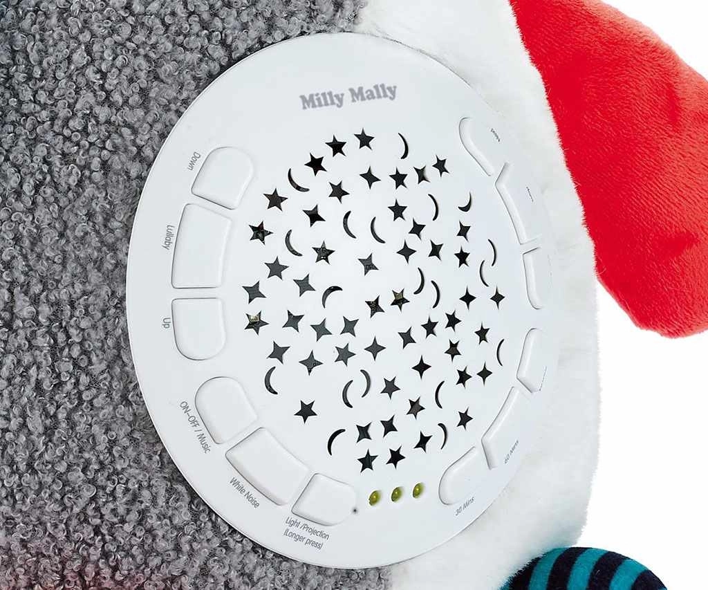 Het pluchen nachtlampje panda met projector MILLY MALLY creëert een kalmerende sfeer voor gemakkelijk inslapen. Zachte lichtprojecties van sterren en maan in verschillende kleuren worden aangevuld met rustgevende melodieën en natuurgeluiden die kinderen van nature tot rust brengen.
