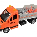 Deze oranje truck met laadplatform en neerklapbare oprijplaten biedt kinderen een authentieke ervaring van stadsdiensten en wegwerkzaamheden. De vliegwielaandrijving zorgt voor een soepele rit zonder batterijen, terwijl realistische details en accessoires de verbeelding en fijne motoriek stimuleren.