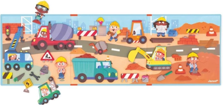 Het magnetische boek van Janod met als thema de bouwplaats is een perfecte keuze voor zowel plezier als leren. Kinderen kunnen verschillende scènes samenstellen, verhalen bedenken en hun fijne motoriek en logisch denken trainen. Dankzij de stevige ondergrond en kwaliteitsmagneten blijven de stukjes op hun plek, of je nu thuis bent of reist.