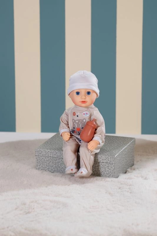 De BABY born Anna pop in beige ondersteunt de fijne motoriek, fantasie en verzorgende vaardigheden. Haar zachte lijfje nodigt uit tot knuffelen en samen in slaap vallen, terwijl de slaapogen bij het neerleggen zacht sluiten. De stijlvolle onesie met tijgerprint en het bijpassende mutsje vormen een schattige outfit voor dagelijks speelplezier.