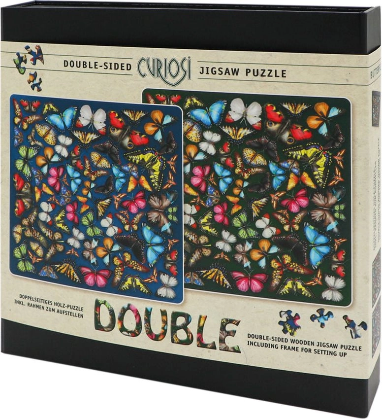Ontdek dubbel zoveel plezier met de dubbelzijdige houten puzzel Curiosi Double met het thema vlinders. Je krijgt twee afbeeldingen in één, ongewone vormen van stukjes en hoogwaardige houten afwerking voor een lange levensduur. In de verpakking zit ook een praktische lijst voor eenvoudig leggen en tentoonstellen.