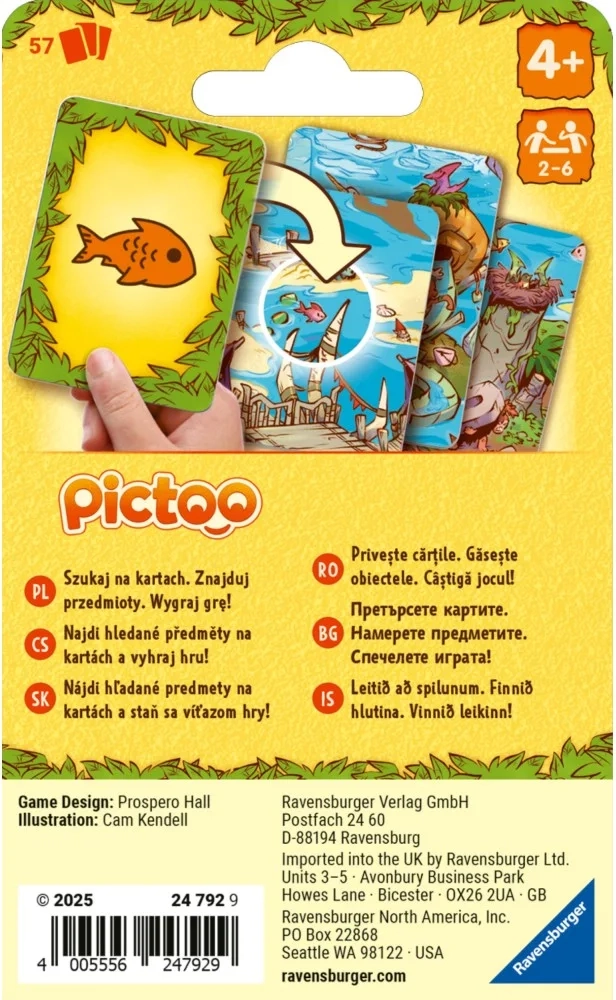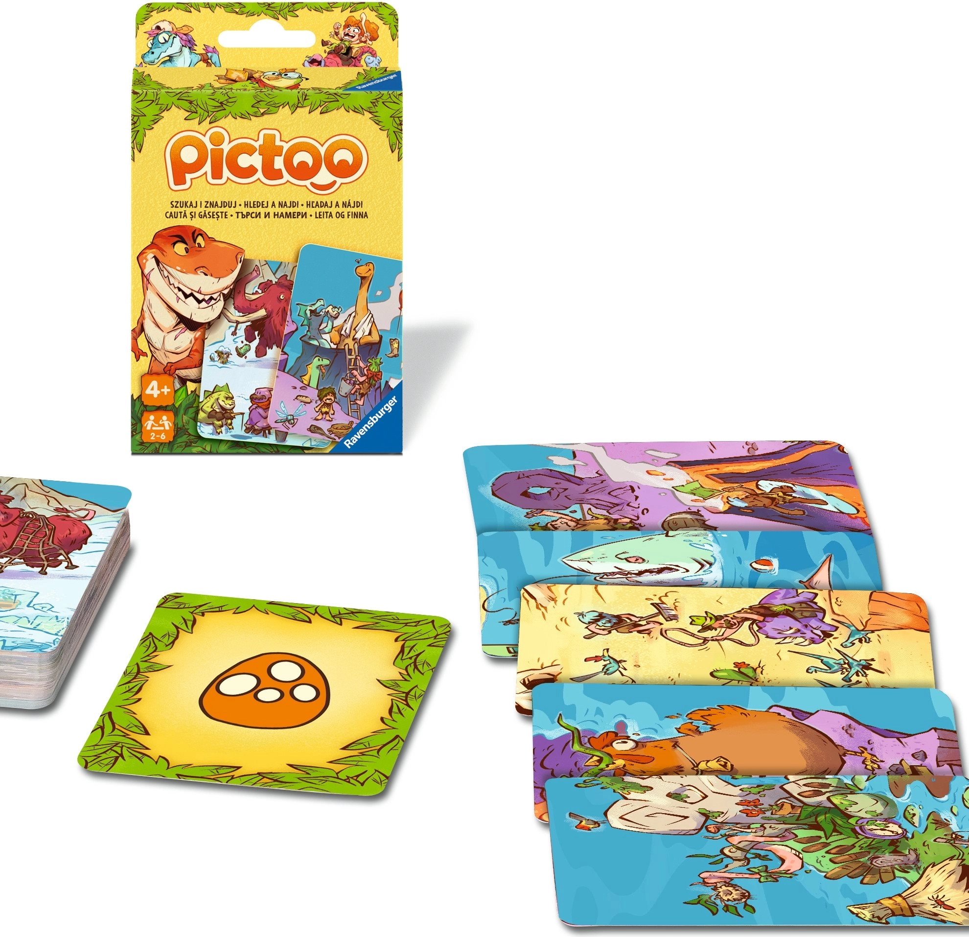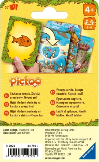 Geniet van het snelle observatiespel Ravensburger Pictoo: dinosaurussen, waarin spelers objecten op de kaarten zoeken en proberen zo snel mogelijk al hun kaarten af te leggen. Geweldige fun voor familie en vrienden met populaire dinosaurusmotieven – de snelste wint!