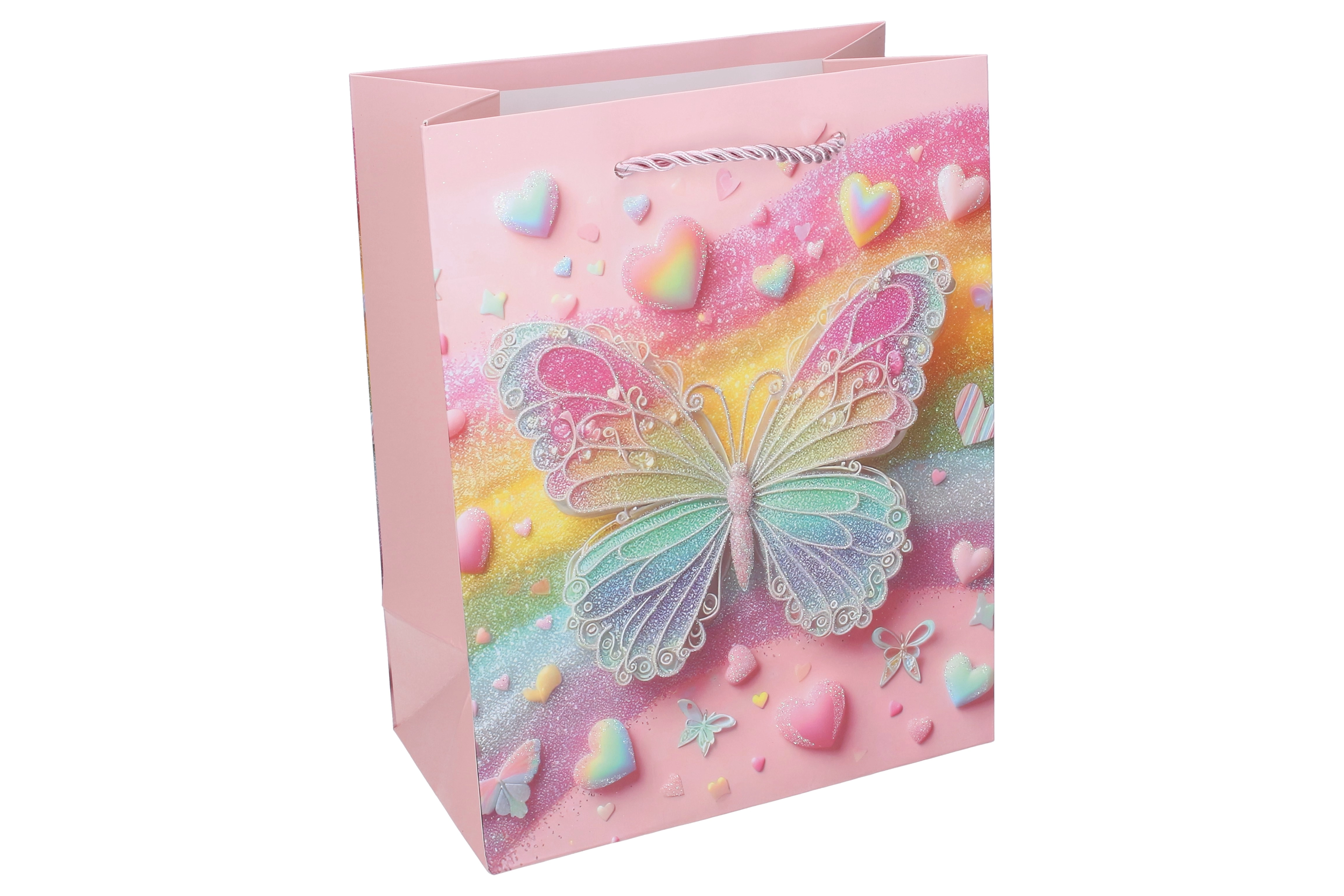 Dankzij de stevige papieren constructie, de verstevigde bodem en de gedraaide koordhandvatten is de tas comfortabel en betrouwbaar om te dragen. Glanzende en sprankelende accenten op de vlinders geven het cadeau een bijzondere uitstraling die zowel kinderen als hun ouders zal bekoren.